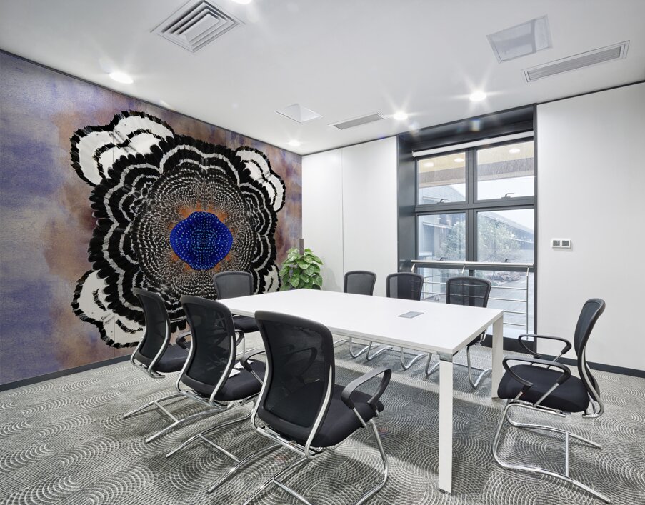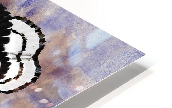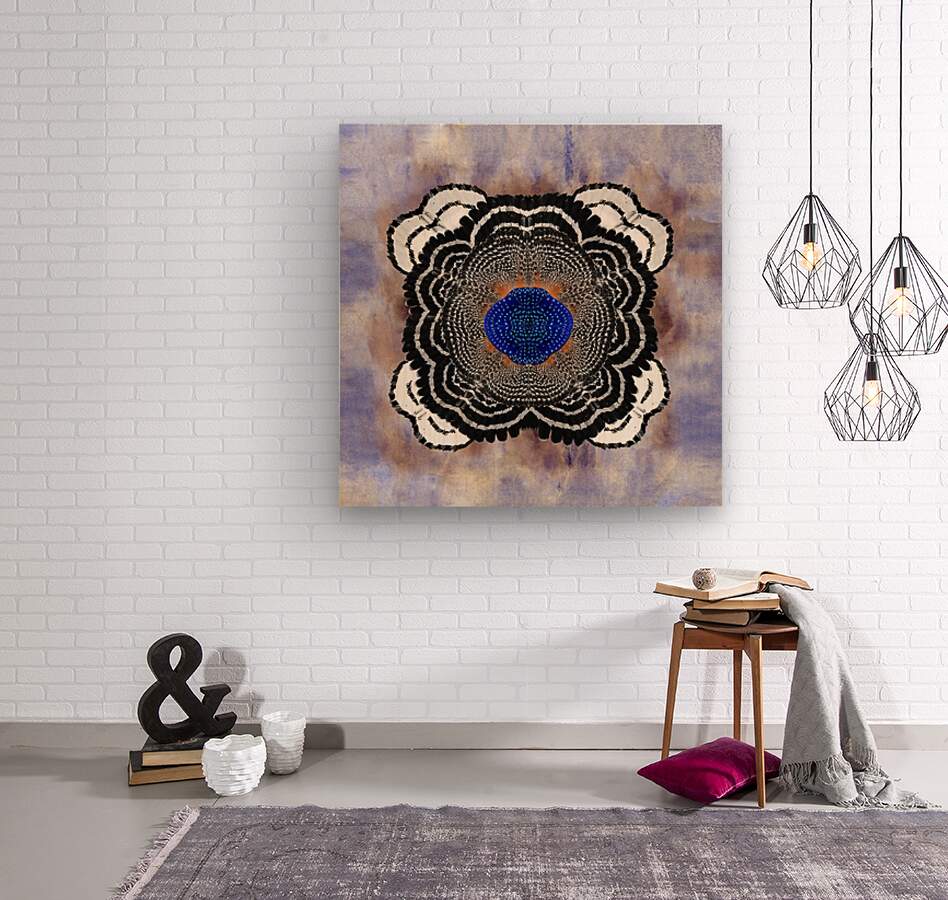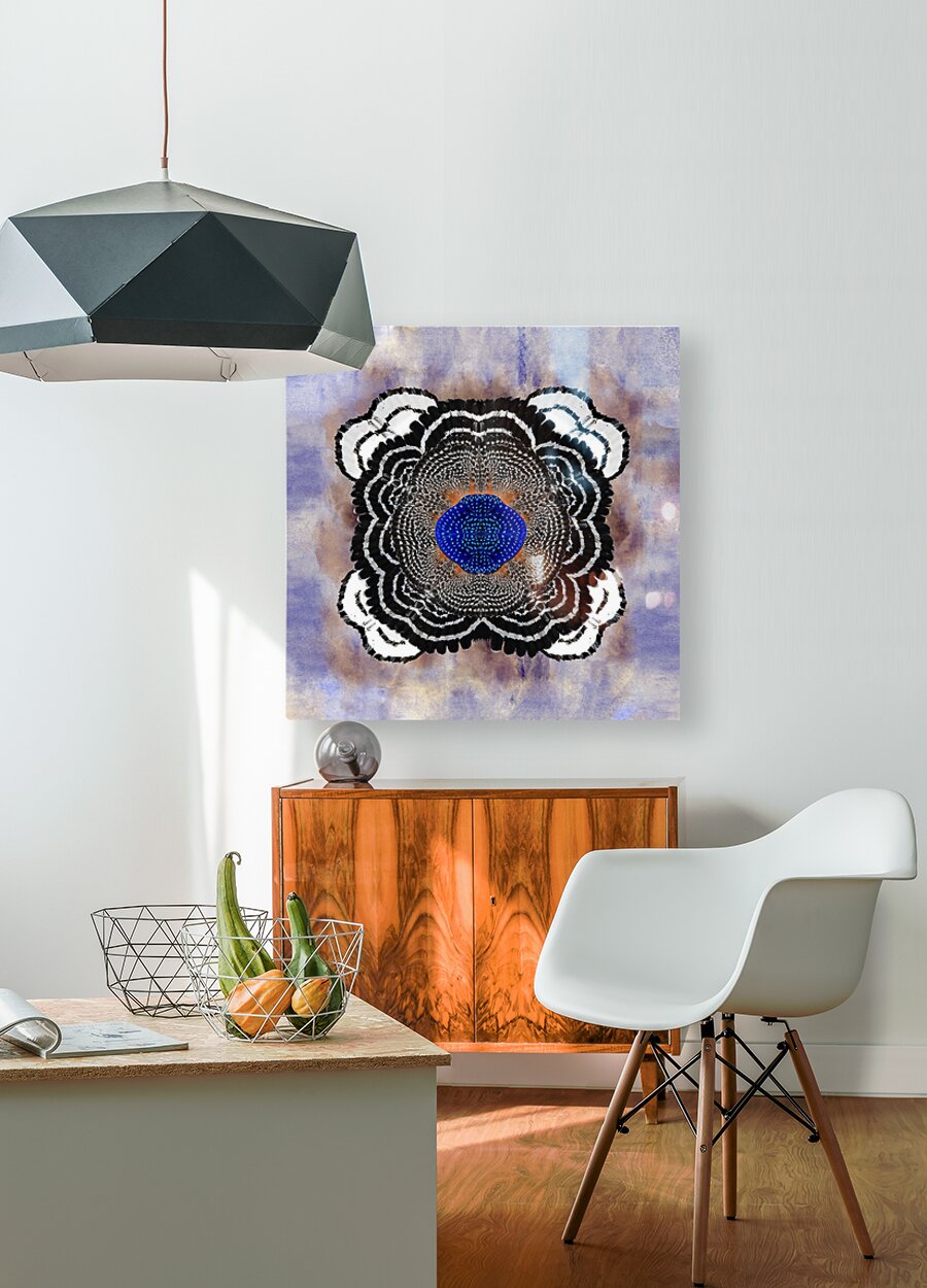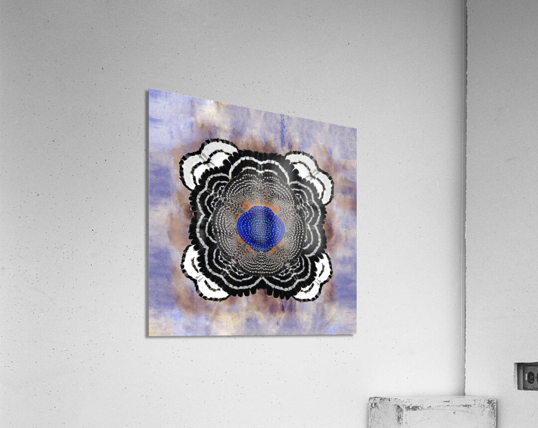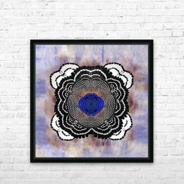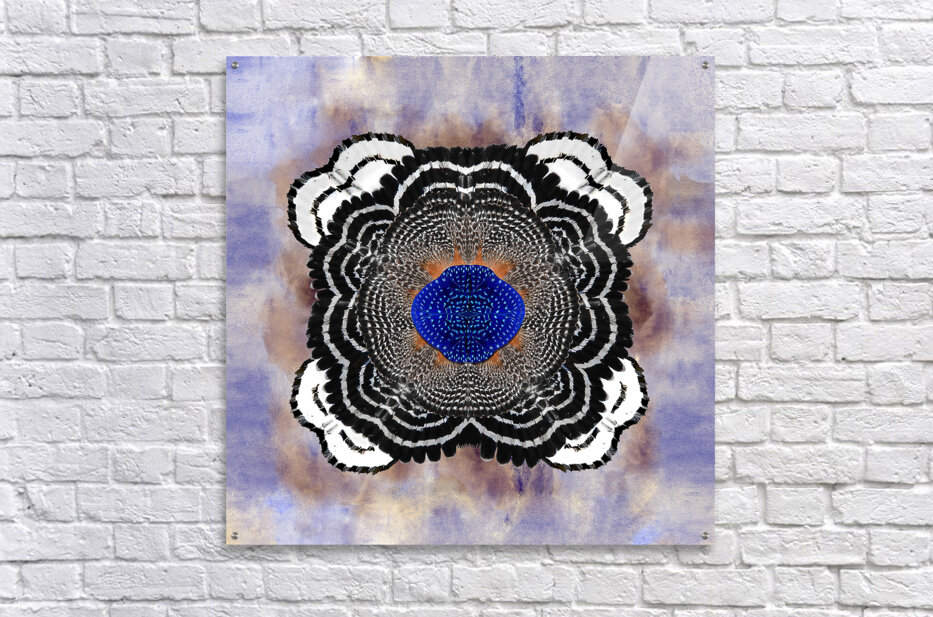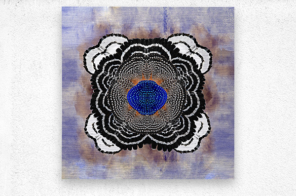 A vibrant abstract composition inspired by the red shouldered hawk, this work of art meticulously designed with every detail in mind makes this a timeless masterpiece. A three dimensional symmetrical pattern revealing an incredible striking motif reflecting petal-like shapes adorned with variant hues of black and titanium white. The innermost center features blue toned brushstrokes exhibiting mosaic abstractions inspired by the cryptic blue cracker butterfly. The backdrop features a subtle wash of blue, iridescent ivory, and periwinkle hues in watercolors, which contrasts with the crispness of the central design.