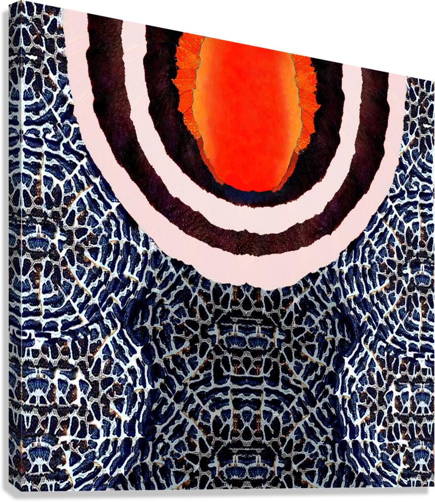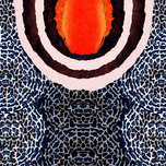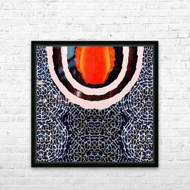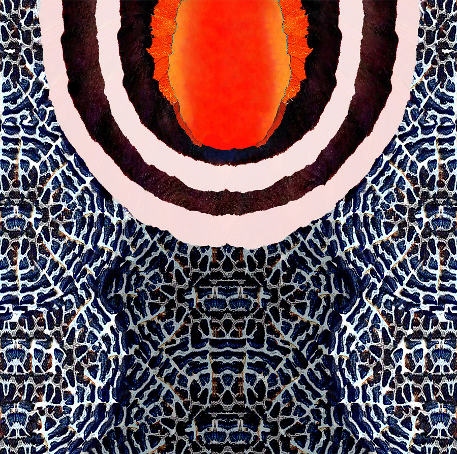 A vibrant yellow-orange circular pattern exhibiting radial patterns of dark value from within sits at the heart of concentric rings displayed in a mos...[+]