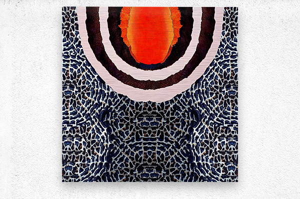 A vibrant yellow-orange circular pattern exhibiting radial patterns of dark value from within sits at the heart of concentric rings displayed in a mosaic maze-like pattern. This brilliant work of art is the interpretation of the greatest star in our atmosphere, the sun, in a strong visually impacted abstract style surrounded by an unobstructed view of grand scale, the sky, also known as the celestial sphere.